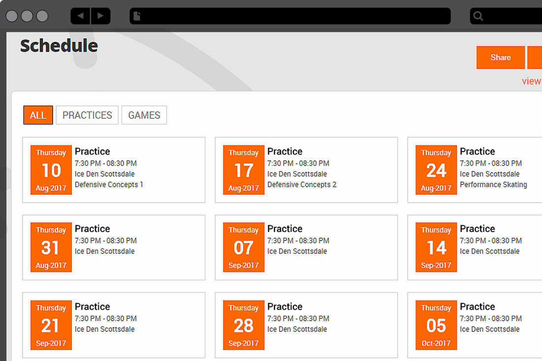 Setup your team schedule (practices and games) and share it your team. Those you share it with have the option of using their own calendar software to subscribe and get automatic updates. Include your plans in the events so the team can be ready for that next practice!